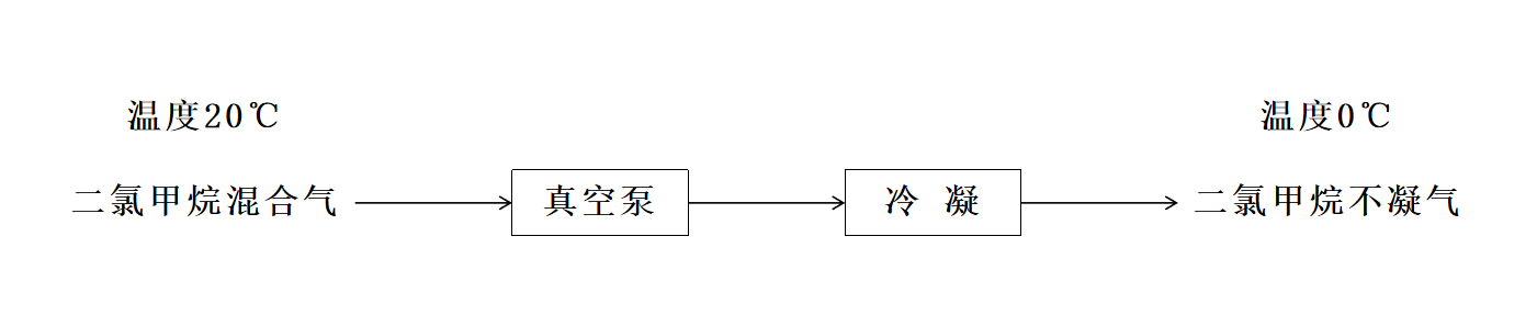以二氯甲烷和空氣的混合氣為例:20℃時二氯甲烷的飽和蒸氣壓是47.39KPa,由公式(2)計算可知,此時二氯甲烷在混合氣中的含量約為46.8%??紤]到真空泵前后的氣體壓力變換不大,將該混合氣降到0℃。0℃時二氯甲烷的飽和蒸氣壓是19.2KPa,二氯甲烷在混合氣中的比例約為18.9%。由此可以看出,采用圖(1)所示的流程,將二氯甲烷和空氣的混合氣由20℃降為0℃,約有74%的二氯甲烷冷凝析出變?yōu)橐后w溶劑。但是仍有26%的二氯甲烷不凝氣體隨混合氣體進(jìn)入后續(xù)廢氣處理裝置。