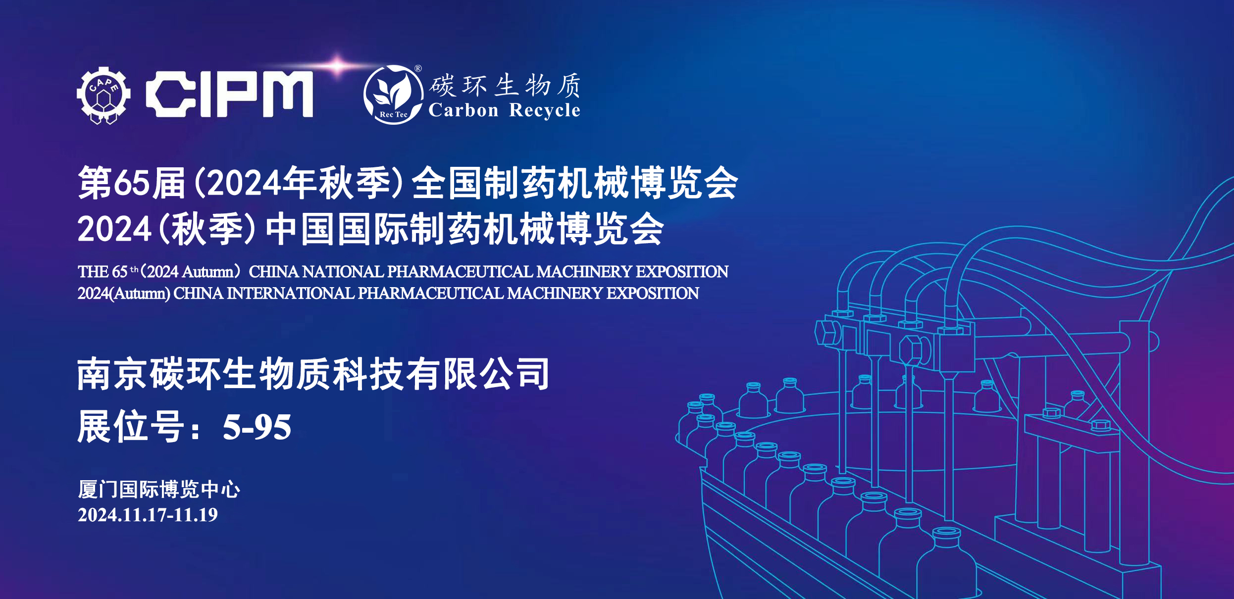 南京碳環(huán)生物質(zhì)科技有限公司將于2024年11月17日-19日在廈門(mén)國(guó)際博覽中心參加第65屆 (2024年秋季) 全國(guó)制藥機(jī)械博覽會(huì)2024 (秋季) 中國(guó)國(guó)際制藥機(jī)械博覽會(huì)(以下簡(jiǎn)稱(chēng)“藥機(jī)博覽會(huì)”),誠(chéng)摯邀請(qǐng)您蒞臨指導(dǎo)。