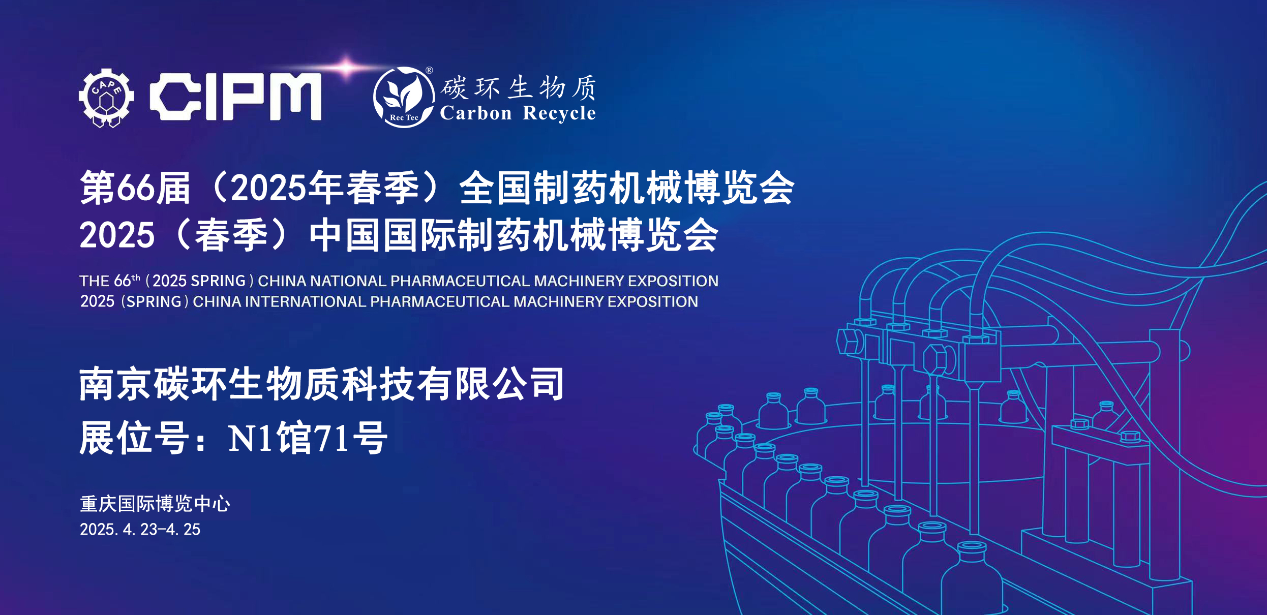 南京碳環(huán)生物質(zhì)科技有限公司將于2025年4月23日-25日在重慶國際博覽中心參加第66屆(2025年春季)全國制藥機(jī)械博覽會(huì)暨2025(春季)中國國際制藥機(jī)械博覽會(huì),誠摯邀請(qǐng)您蒞臨指導(dǎo)。